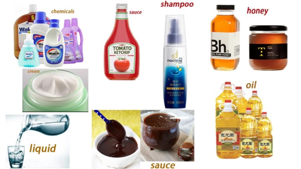 Полувискозни и вискозни течности; котешки, горчица, сиропи, салса, майонеза, мед, фъстъчено масло, желета, сосове за потапяне, балсам за устни, шампоан, гъсти сапуни, стайлинг гелове, маски за лице, восък, лепило, мазнини, уплътнители, силикон и много други