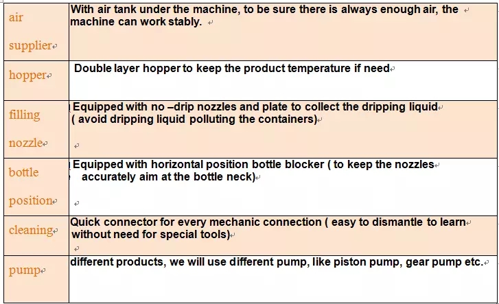 Тази машина е специално направена за всички видове вискозитет / течност в хранително-вкусовата промишленост, химическата промишленост и комод, като моторно масло, моторно масло, салата, гел за ръчно измиване, кокосово масло, соев сос, сусам, шампоан, течен сапун, моторно масло , спирачно масло, олио за готвене, доматен сос, напитка, етерично масло, растително масло, мед, черен пипер, фъстъчено масло, кисело мляко, сок, напитки и др. Цялата контактна част с течността / соса е висококачествена неръждаема стомана. Машината приема бутална помпа за пълнене. Ако регулира позиционната помпа, тя може да напълни всички бутилки в една машина за пълнене, с бърза скорост и висока точност.