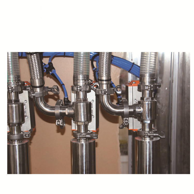 3. Може да посрещне нуждата от по-висока мощност с приемане на бутилка с две шини, пълнене с две релси и завинтване на капачка с две дюзи или валцуване и пресоване. Тази машина има висока точност на пълнене и може да се разглобява и стерилизира удобно, като се използва бързо сглобяема помпа от неръждаема стомана. С използването на постоянно завинтване на капачката с въртящ момент и пневматичен протектор, уплътнената уста е херметична.